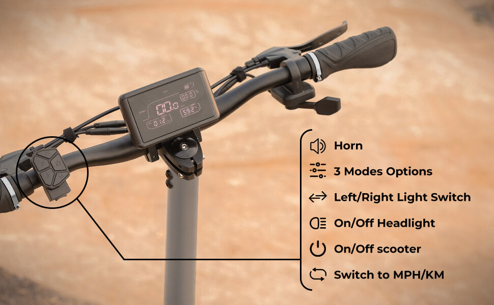 A: We are happy to answer your question. You can switch between riding modes or other settings via the quick function button on the left side of the handle. It has 3 riding modes — ECO mode, driving, sport mode — as well as switch on/off the light, press the horn, and other operations.
