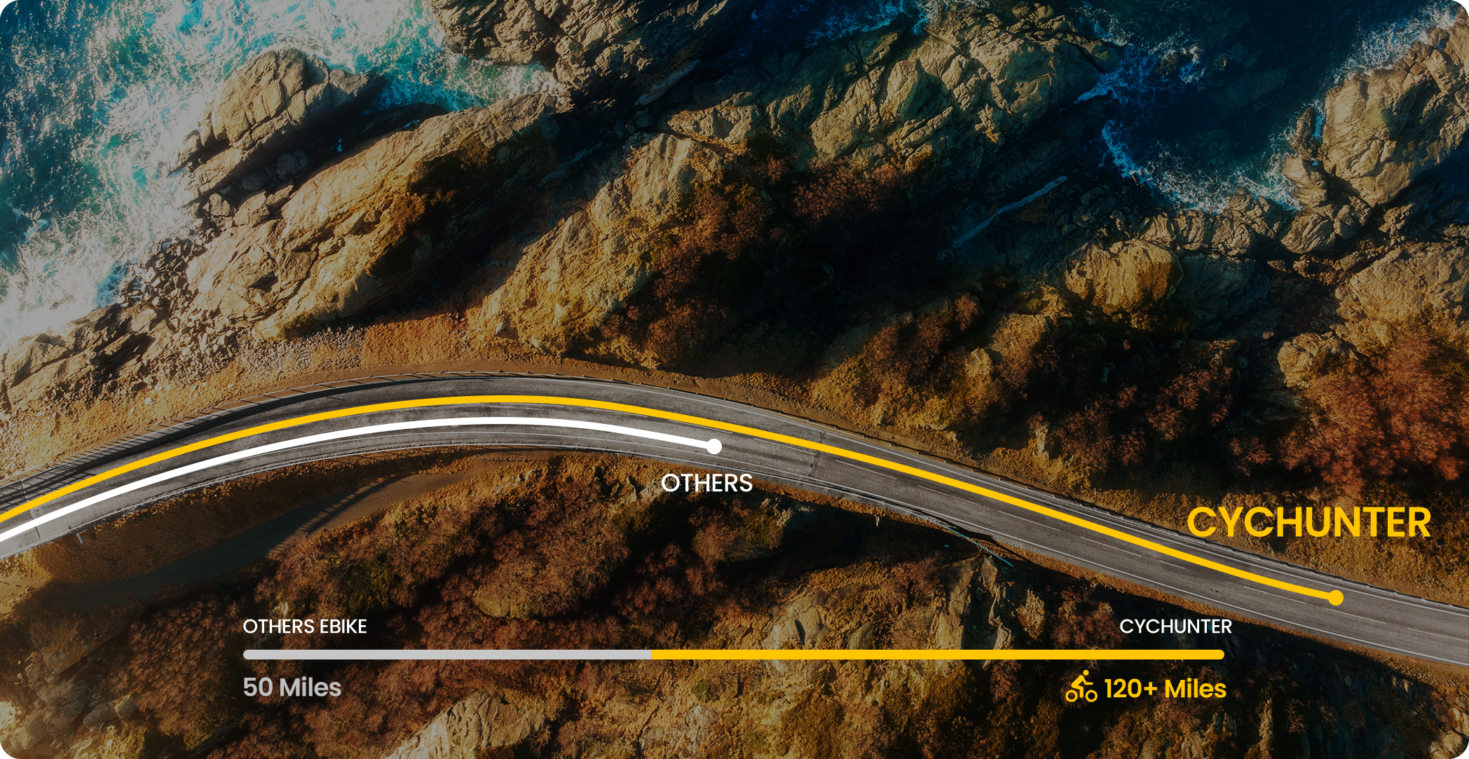 Boasting a remarkable 120+ mile maximum range, the CycHunter is powered by a dual 48V 13+13Ah battery system. With arange of 200% longerthan competitors, it ensures extended rides with unmatched reliability and power